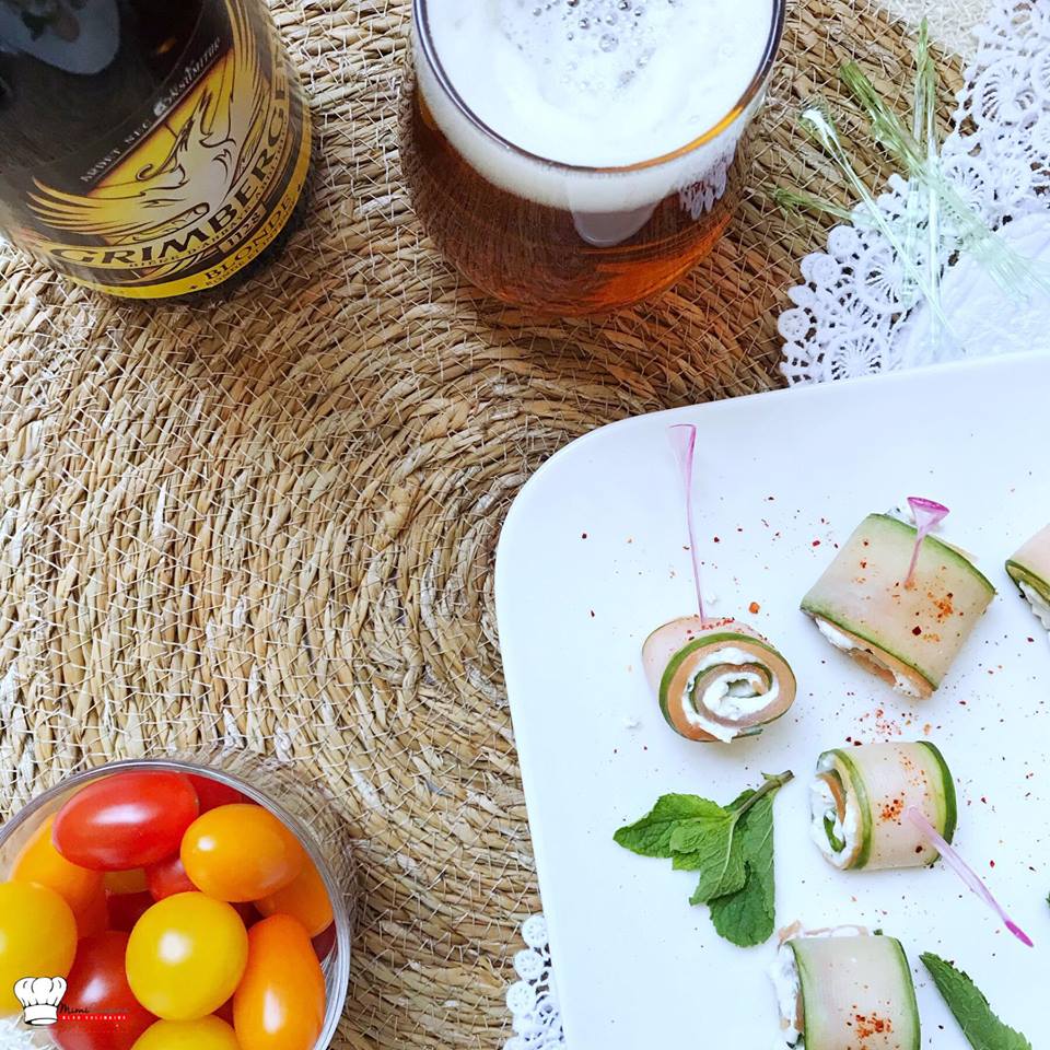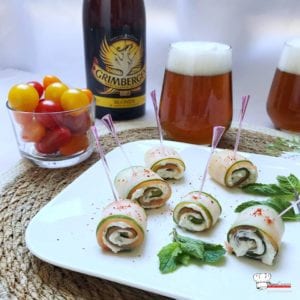 Mon mari étant un grand fan de bières, j’ai tout de suite accepté. Les apéros entre amis avec de la bière, j’adore ça ! J’ai voulu proposer une recette fraîche, remplie de délicieuses saveurs et rapide à faire pour les apéritifs improvisés. J’ai pensé à plusieurs recettes avec du fromage (comme j’adore !) ou des mini croquettes de légumes à tremper dans une sauce barbecue mais mon idée s’est arrêtée sur ces Roulés de Concombre au Saumon et Crème Citron Menthe Ciboulette, un mélange parfait pour faire ressortir tous les arômes épicés de cette superbe bière blonde Grimbergen.