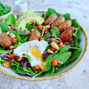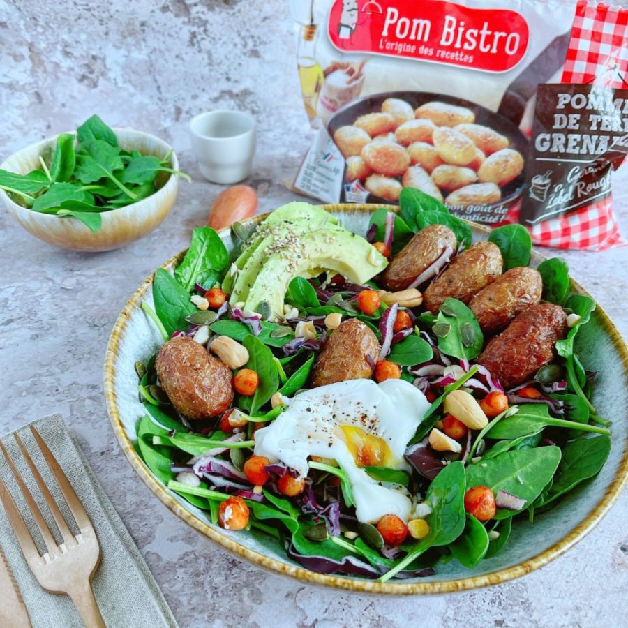 Je vous propose, aujourd’hui, une salade saine et gourmande avec des jeunes pousses d’épinards, du chou rouge, des pois chiches grillés au paprika, de l’avocat, des pommes de terre grenailles Pom Bistro, des noix de cajou et un œuf poché. Les légumes sont à varier selon les saisons et selon vos goûts. Place à la préparation de ma Salade bowl veggie aux pommes de terre rôties.