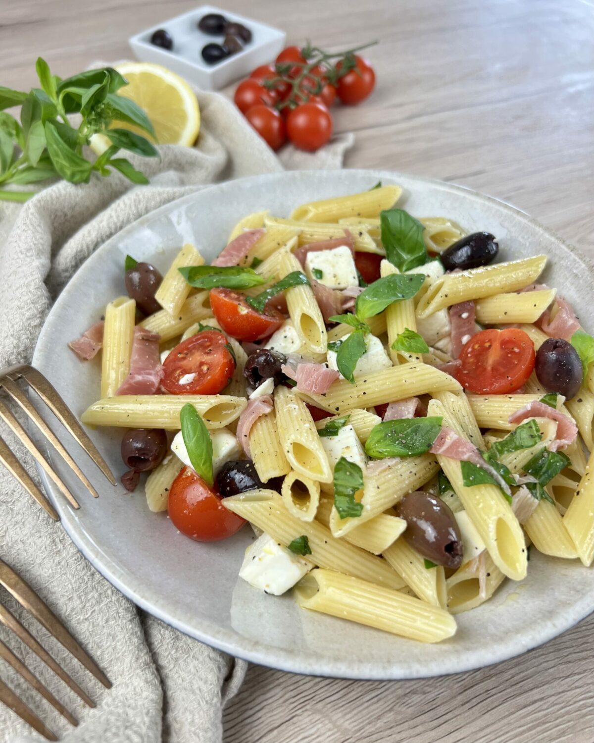 - Mélangez les pâtes avec tomates, jambon, féta, olives noires, basilic.