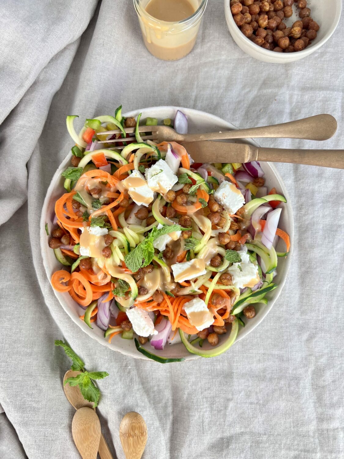 Et pour encore plus de saveurs, vous pouvez ajouter du fromage &, des pois chiches, enfin bref ce que vous voulez ! Et pour la touche finale, une sauce cacahuète viendront parfaitement compléter tous les ingrédients de cette salade.