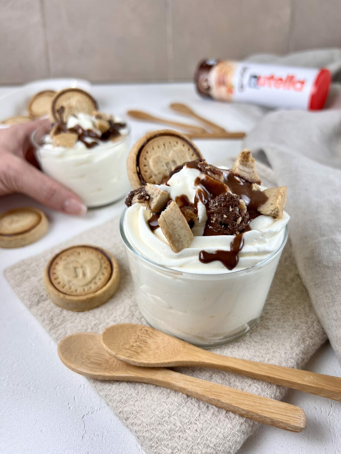 - Sortez vos verrines et ajoutez le chocolat fondu et le topping Nutella® Biscuits.
