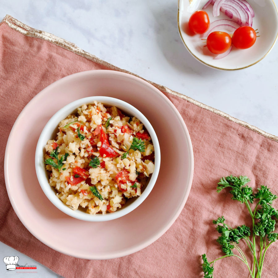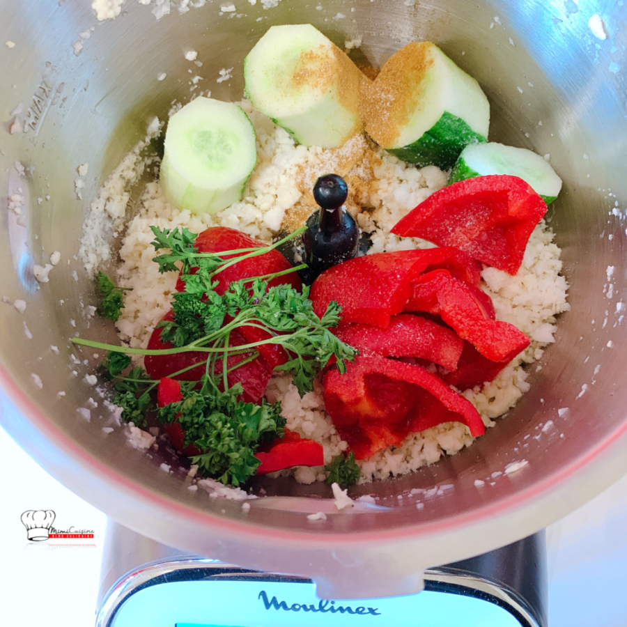 C’est frais et délicieux, on peut le manger en hiver et en été accompagné de viande ou de poisson. Le taboulé de chou-fleur idéal pour un rééquilibrage alimentaire au Companion. Poivron, concombre, cumin, persil, huile d’olive et jus de citron. C’est une recette issue de mon livre Mes recettes de saison au Companion aux éditions Larousse Cuisine. Place à la préparation de mon Taboulé Chou Fleur Recette Companion