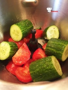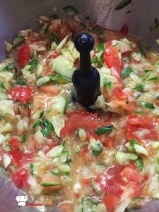 - Dans le bol muni du couteau UltraBlade, mettre les tomates coupées en 4, le concombre coupé en gros morceaux, les feuilles de menthe, le jus de citron, l'huile d'olive, le sel, le poivre