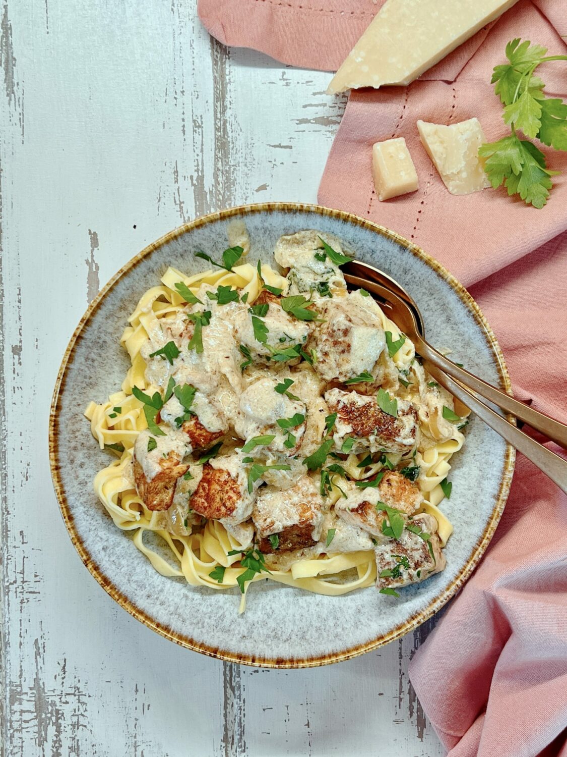 Aujourd’hui je vous propose comme on dit en italien « tagliatelle al salmone »ou bien les Tagliatelles aux crevettes sauce parmesan; tellement tellement savoureuse et hyper réconfortante ! J’ai choisi de prendre des tagliatelles mais vous pouvez aussi prendre d’autres variétés de pâtes fraiches. Cette recette est tellement pratique et super simple à faire, mes enfants l’adorent et se régalent ! Le dressage de l’assiette permet aussi de donner cet aspect super savoureux et une touche en plus avec des herbes comme le persil ! En plus, cette herbe apporte une petite touche de fraîcheur !