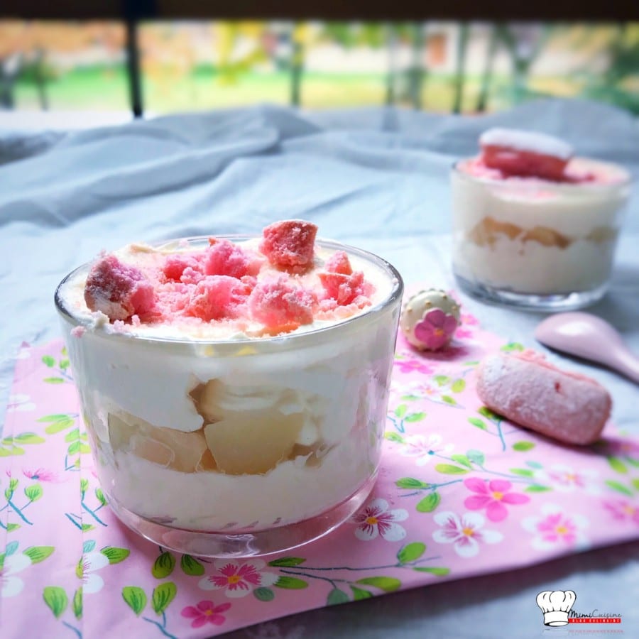 - Imbibez 2 mini biscuits rose de Reims de sirop de sucre puis placez-les dans le fond de chaque verrine, recouvrez de crème mascarpone, tapissez de dés de poire, disposez 2 mini biscuits rose de Reims imbibés de sirop de sucre, recouvrez de crème mascarpone puis terminez par émiettez un mini biscuit rose.