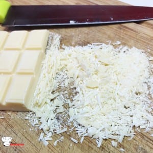 - Avec un couteau ou à l'aide d'une râpe à fromage, râpez 30 grammes de chocolat blanc.