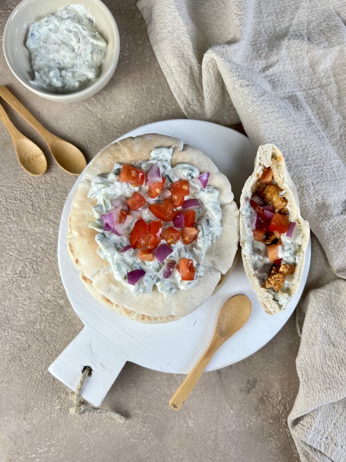 - Garnis le pain pita avec du poulet, du tzatziki, de l'oignon rouge et de la tomate.