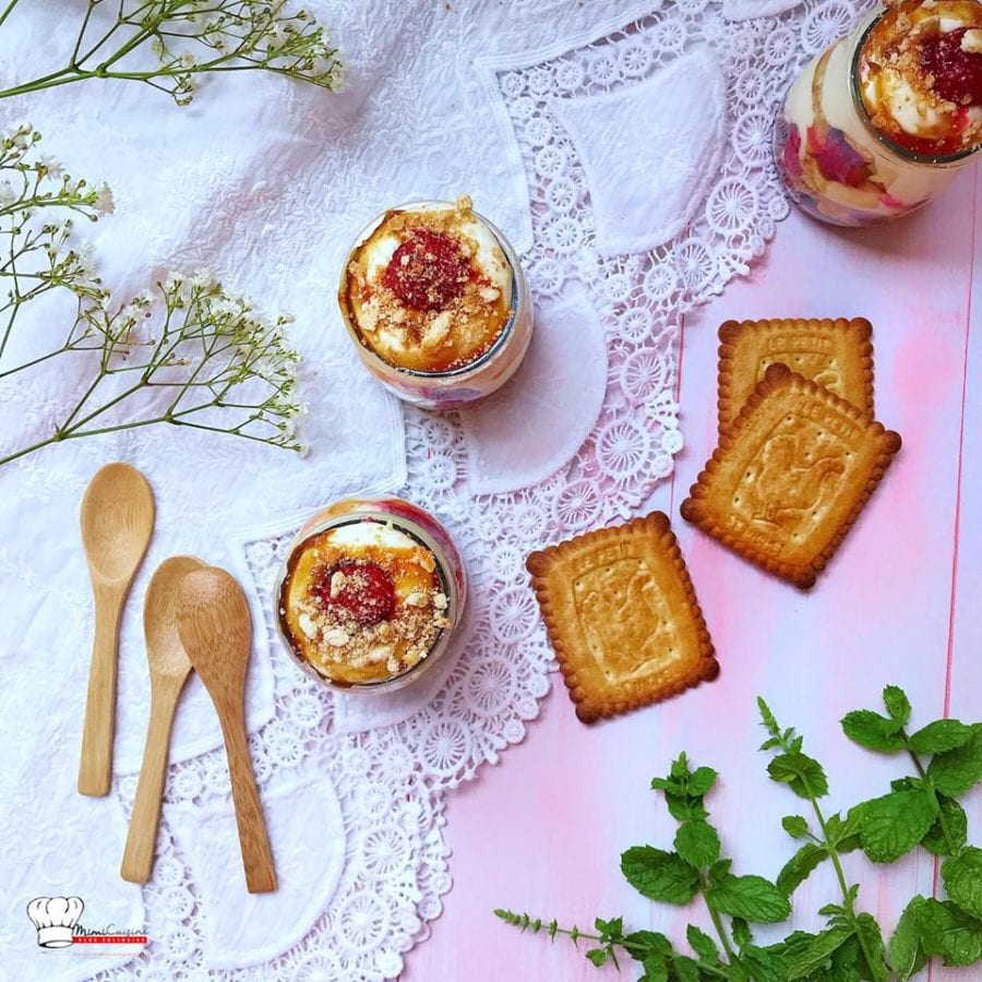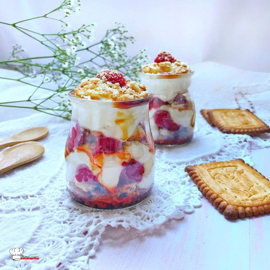 - Finissez par déposer une framboise sur le dessus, mettez un filet de caramel et des biscuits émiettés