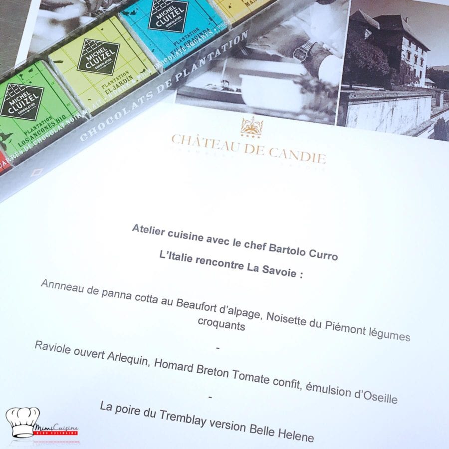 En avant première, nous avons testé la masterclass animé par le Chef Bartolo Curro. À partir de cette fin d’année 2018, le château de Candie met en place des ateliers pour apprendre et s’enrichir de l’expérience du chef. En plein coeur de la cuisine de l’Orangerie, avec comme thème « L’Italie rencontre La Savoie » nous avons réalisé, un anneau de panna cotta au Beaufort d’Alpage, des ravioles ouvertes Arlequin, homard breton tomates confites, émulsion d’oseille et pour terminer, une poire du Tremblay version Belle Hélène.